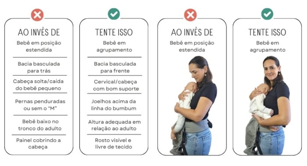 Quando aprendemos a reconhecer o bom posicionamento do bebê em qualquer tipo de sling ou carregador, fica muito mais fácil praticar o babywearing ao longo do tempo de colo.
